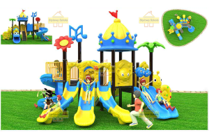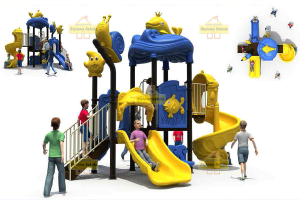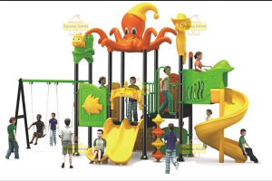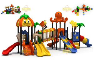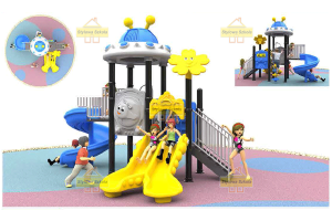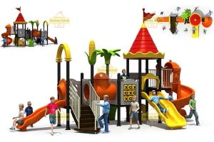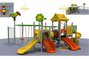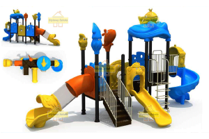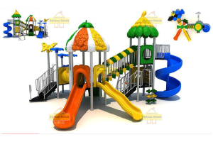 Prezentujemy place zabaw konstrukcji metalowo - plastikowej. Rury nośne i barierki są metalowe, malowane farbą proszkową zewnętrzną. Schody i podesty są również metalowe, pokryte gumą zwiększającą bezpieczeństwo antypoślizgowe.